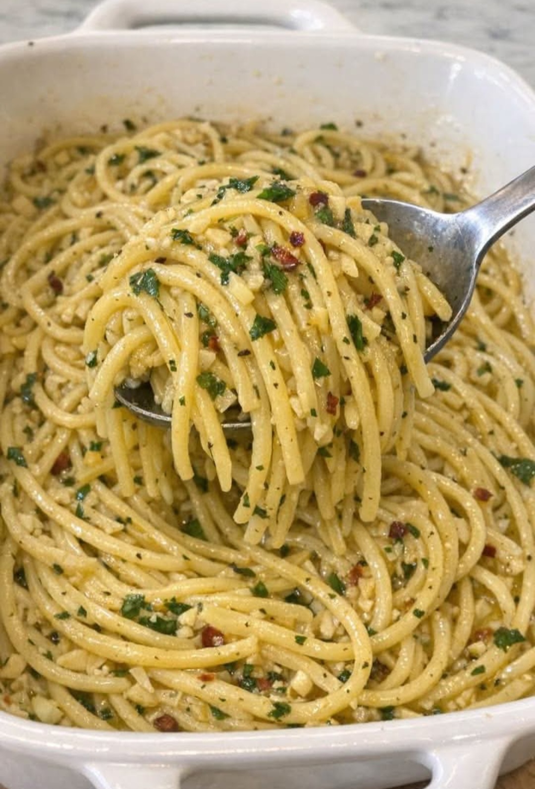 This is the heart of the dish. The pasta cooks directly in the buttery liquid, soaking up flavor like a sponge. Thin spaghetti works especially well because it becomes tender faster and absorbs the sauce beautifully.