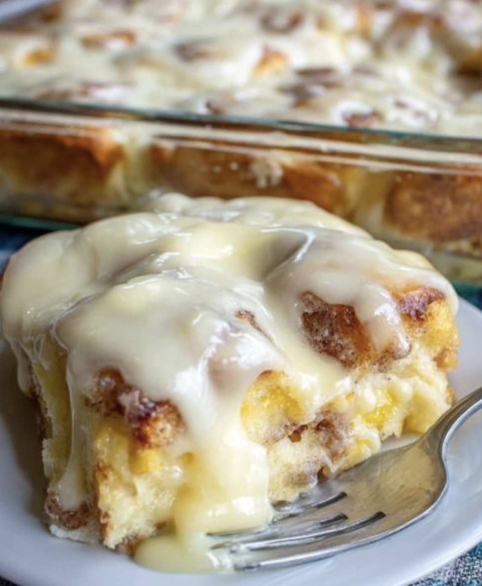 Pour the icing generously over the warm casserole. Serve immediately and enjoy!