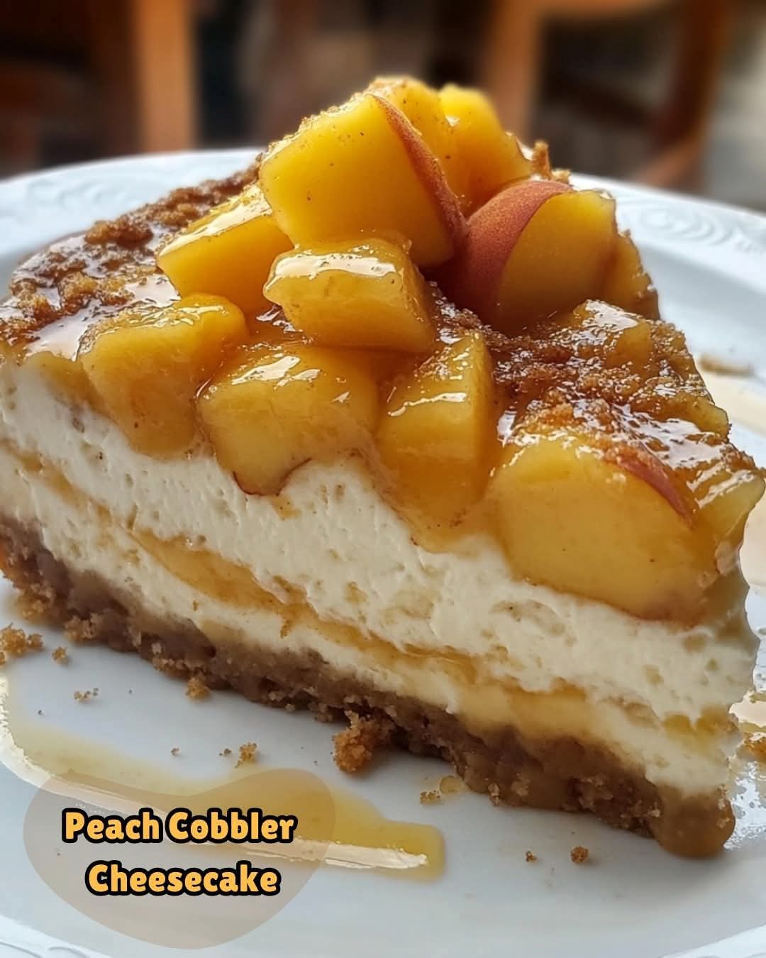 Enjoy your Peach Cobbler Cheesecake with its delicious combination of creamy cheesecake and sweet peach cobbler!