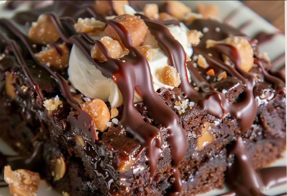 7. Finish & serve – Once baked, top with the remaining peanut butter cups. Let cool slightly, then serve warm with ice cream or whipped cream.
