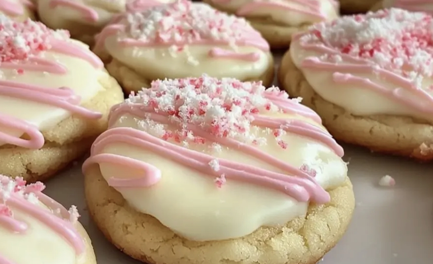 Drizzle the cooled cookies with melted white chocolate and sprinkle extra crushed candy canes on top.