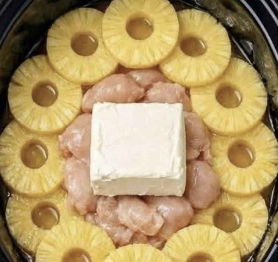 • Scatter the pineapple chunks evenly around and over the chicken breasts.