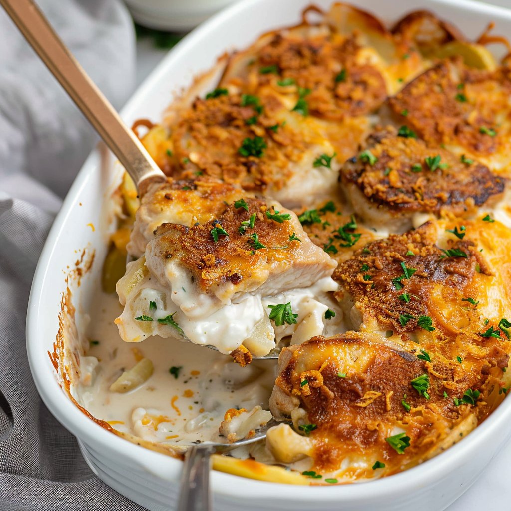 There’s something so nourishing about a classic baked dish like this pork chop casserole. It’s easy enough for a Wednesday night, yet indulgent enough for a Sunday dinner with family. Rich, savory, cheesy, and topped with a crispy crunch – it checks every comfort food box.