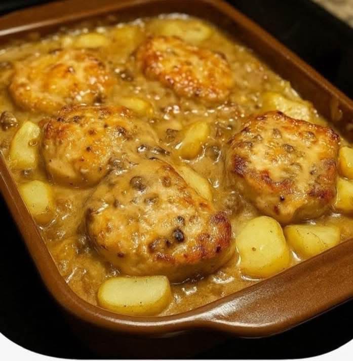 Whether you’re feeding a hungry family or prepping a make-ahead meal for a cozy night in, this dish is a winner. The savory blend of onion soup mix, cream of mushroom soup, and milk creates a luscious gravy that pairs perfectly with the juicy pork and soft, buttery potatoes.