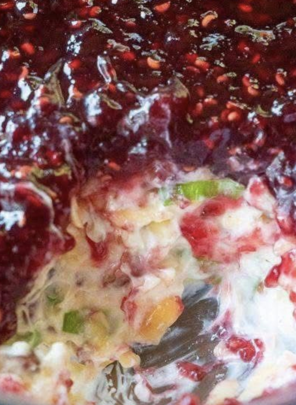 This Raspberry Dip has become a cult favorite for good reason. The combination of sharp, savory cheddar, creamy mayonnaise, crunchy pecans, and fresh green onions creates a complex, satisfying base. The sweet-tart raspberry preserves on top add a bright, fruity contrast that cuts through the richness.