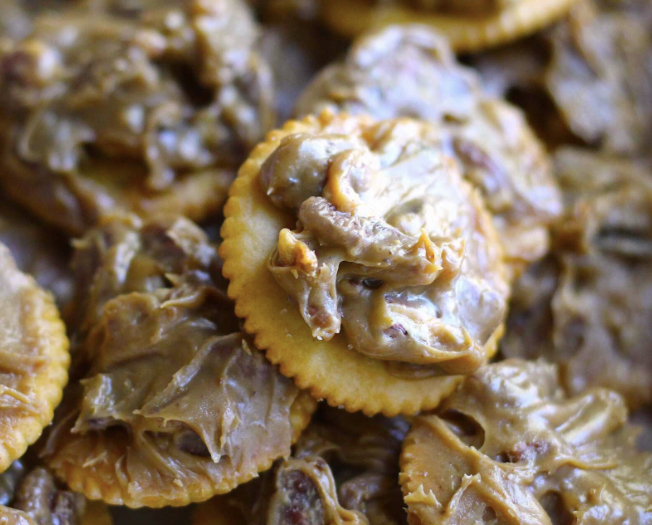 Using a greased cookie scoop or two spoons, place a generous amount of the caramel pecan mixture on top of each Ritz cracker.