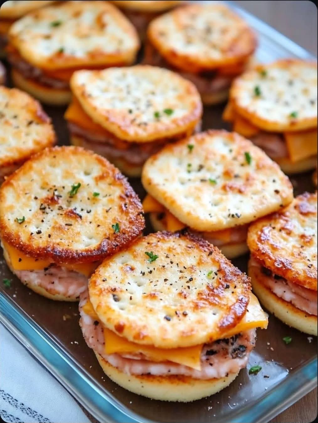 Okay these Ritz Cracker Party Sandwiches are to die for!! They are a cracker version of everyone’s favorite ham sliders. Ham and swiss tucked between two Ritz crackers and then topped with a worcestershire, mustard, butter, onion powder, poppy seed mixture before getting baked in the oven. These are seriously the best appetizer I have ever had!