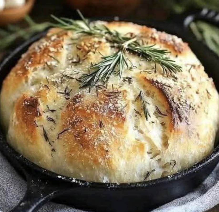 There is nothing more comforting than the smell of freshly baked bread filling your kitchen. This beautiful golden loaf, baked in a skillet and topped with fresh rosemary and herbs, is inspired by traditional Italian flatbreads like focaccia.