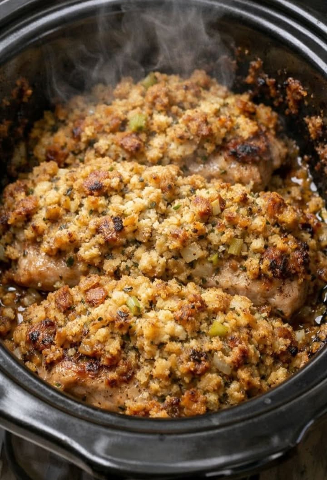 These are the hearty base of the dish. Thick pork chops hold up best in the slow cooker and cook into a tender, juicy, fork-cut texture. The meat releases natural juices as it cooks, which helps flavor and moisten the stuffing.