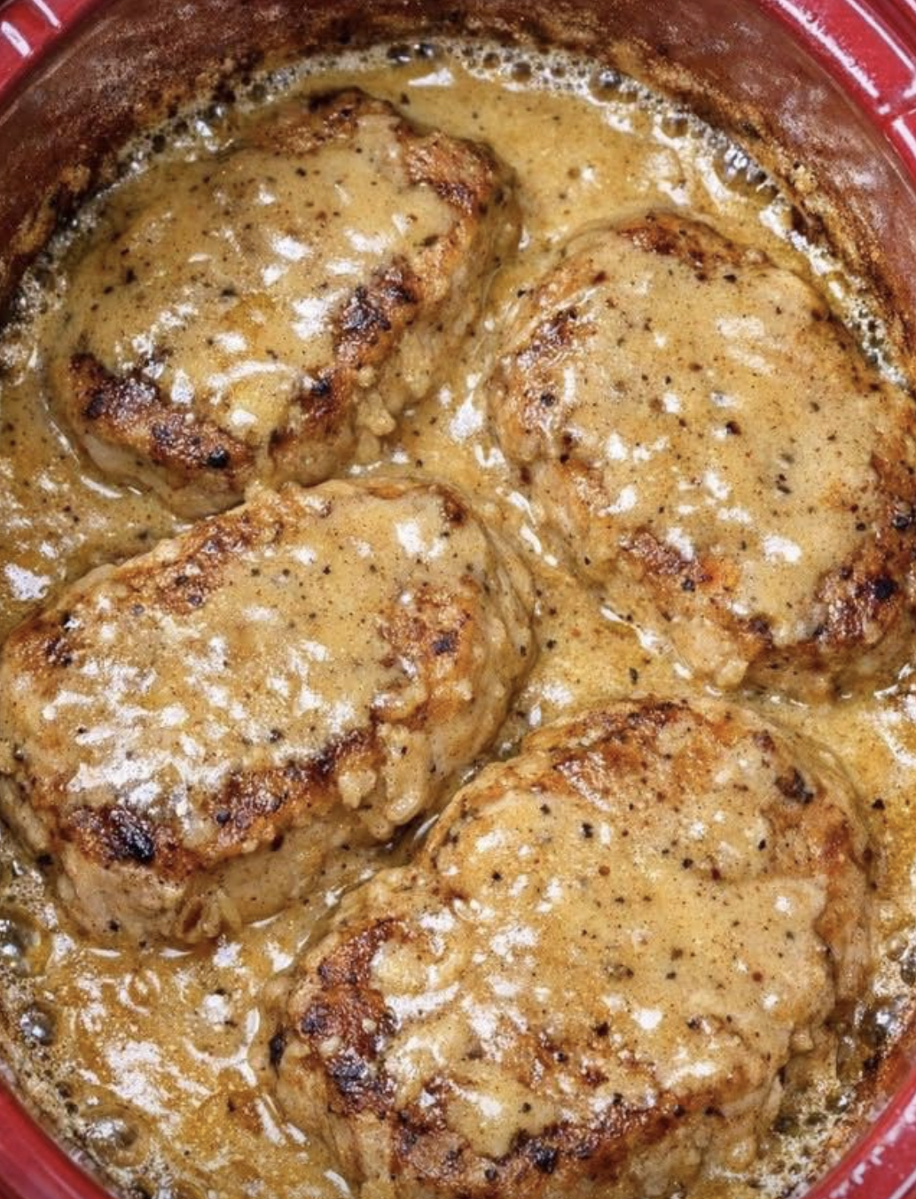 Once the pork chops are done, gently stir the gravy around the edges and over the top to blend any juices that have collected. The sauce should be thick, creamy, and a rich golden brown with little bubbles around the edges.