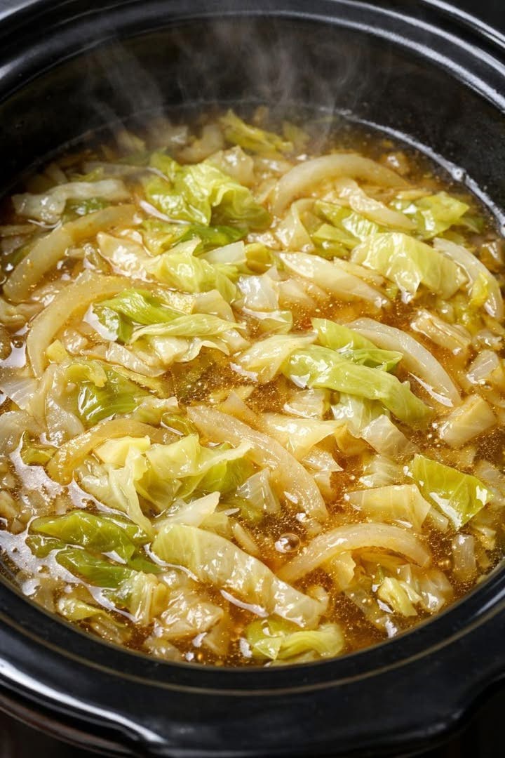 The slow cooker does all the work. The cabbage becomes tender and sweet, the onions turn silky, and the broth transforms into a rich, golden liquid.