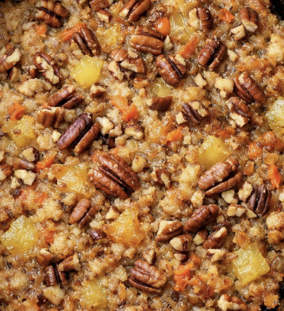 This carrot cake version takes the dump cake concept to new heights. By using crushed pineapple as the sole source of moisture, the cake develops a tender crumb and bright, fruity sweetness that complements the warm spices of the cake mix. Fresh carrots add texture, natural sweetness, and that classic carrot cake identity. Pecans provide crunch and nutty richness, making each bite satisfying and complex.