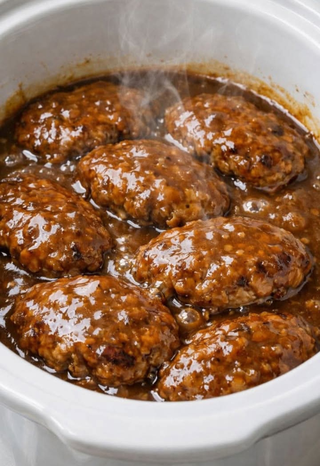 8. Final Flourish: Once cooked, taste the gravy and adjust with a pinch of salt and black pepper if needed. Serve the hot patties straight from the slow cooker, spooning plenty of the rich, savory gravy over each portion.