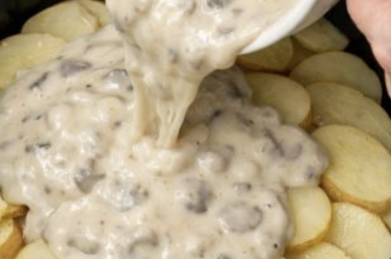 Slowly pour the cream of mushroom mixture evenly over the top of the layered potatoes and ham, making sure to cover as much of the surface as possible. Gently tap the slow cooker on the counter or use the back of a spoon to nudge the top layer so the sauce settles down between the slices.