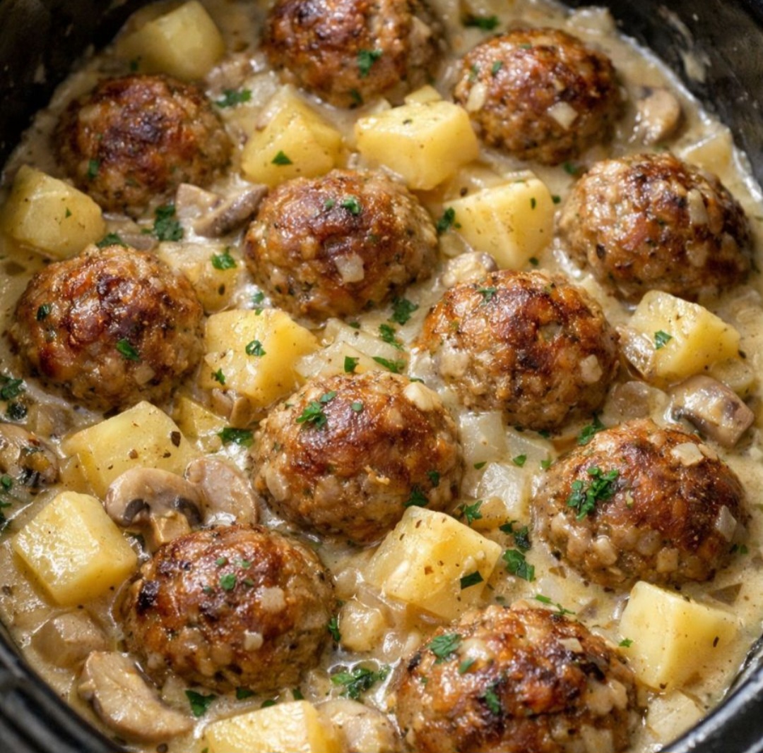 What makes this dish so irresistible is the magic combination of tender potatoes, savory meatballs, and a thick, flavorful gravy that tastes like it simmered all day (because it did—without you lifting a finger). It’s one of those slow cooker meals that fills the house with a “Sunday dinner” smell and disappears faster than anything else on the table.