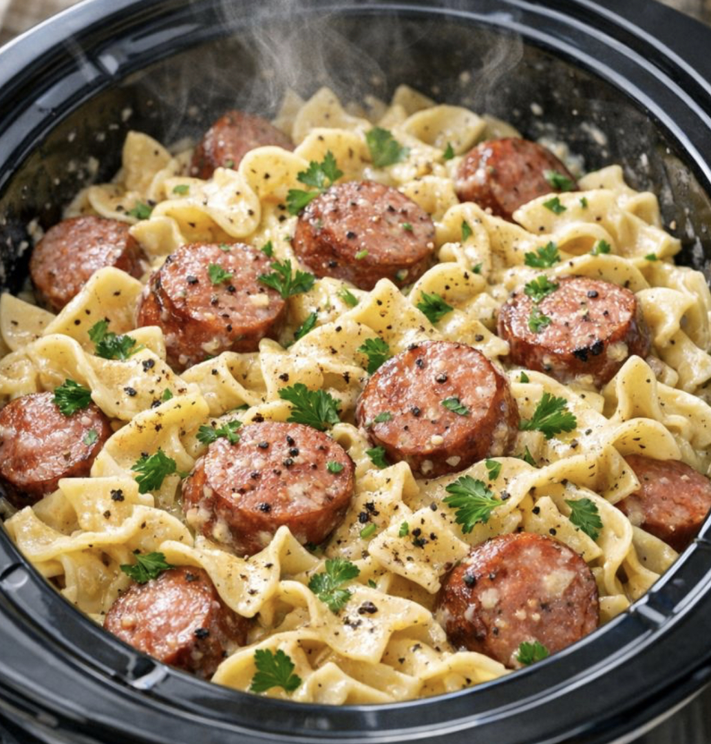 The beauty of this recipe is in its simplicity. You don’t need to pre-cook the noodles. You don’t need to brown the sausage. You just layer everything in the slow cooker — sausage, creamy soup mixture, dry noodles, frozen vegetables — and walk away. A few hours later, dinner is ready.