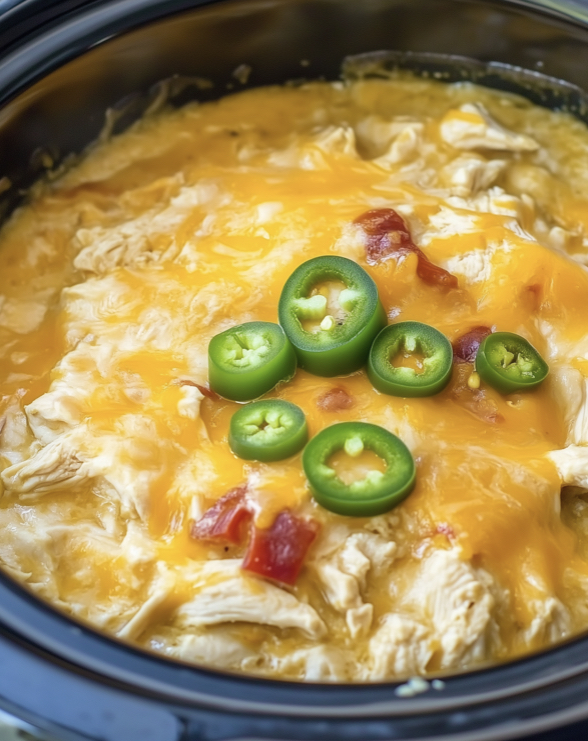Shred the chicken directly in the slow cooker using two forks. Stir in the sour cream, ½ cup of cheddar cheese, and green onion. This adds creaminess, richness, and a fresh pop of flavor.