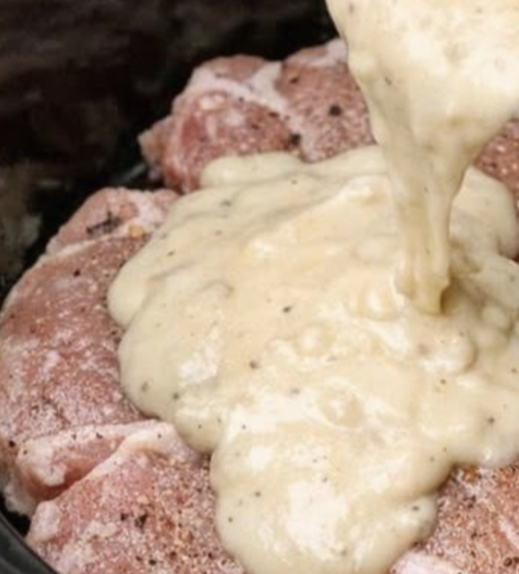 • Pour the soup mixture evenly over the pork chops, using a spatula to spread it and ensure each chop is well coated.