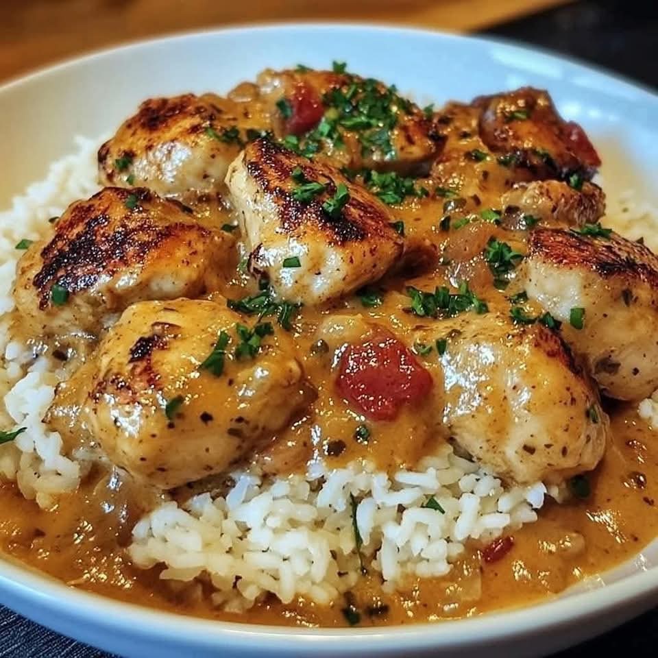 5. In a baking dish, layer the sautéed onions and bell peppers, then place the browned chicken on top. Pour the soup and rice mixture over the chicken.