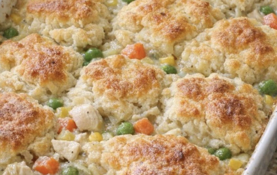 This easy chicken pot pie bake uses just six ingredients and comes together in minutes. A creamy chicken and vegetable filling is topped with a simple biscuit batter that bakes into a golden, fluffy crust.