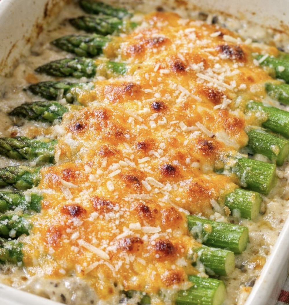 Fresh asparagus is blanketed in a velvety sauce made from cream of mushroom soup, milk, sharp cheddar cheese, and a hint of soy sauce for savory depth. Baked until tender and bubbly, it’s the perfect accompaniment to roast chicken, pork chops, ham, or a holiday turkey.
