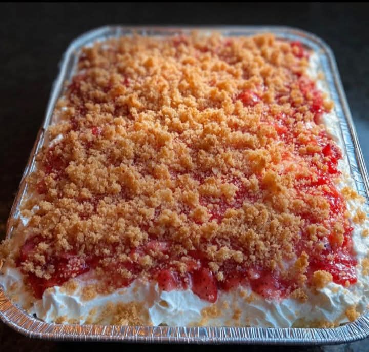 9. Sprinkle chopped strawberries evenly on top, followed by a generous layer of crushed crispy rice cereal for crunch.
