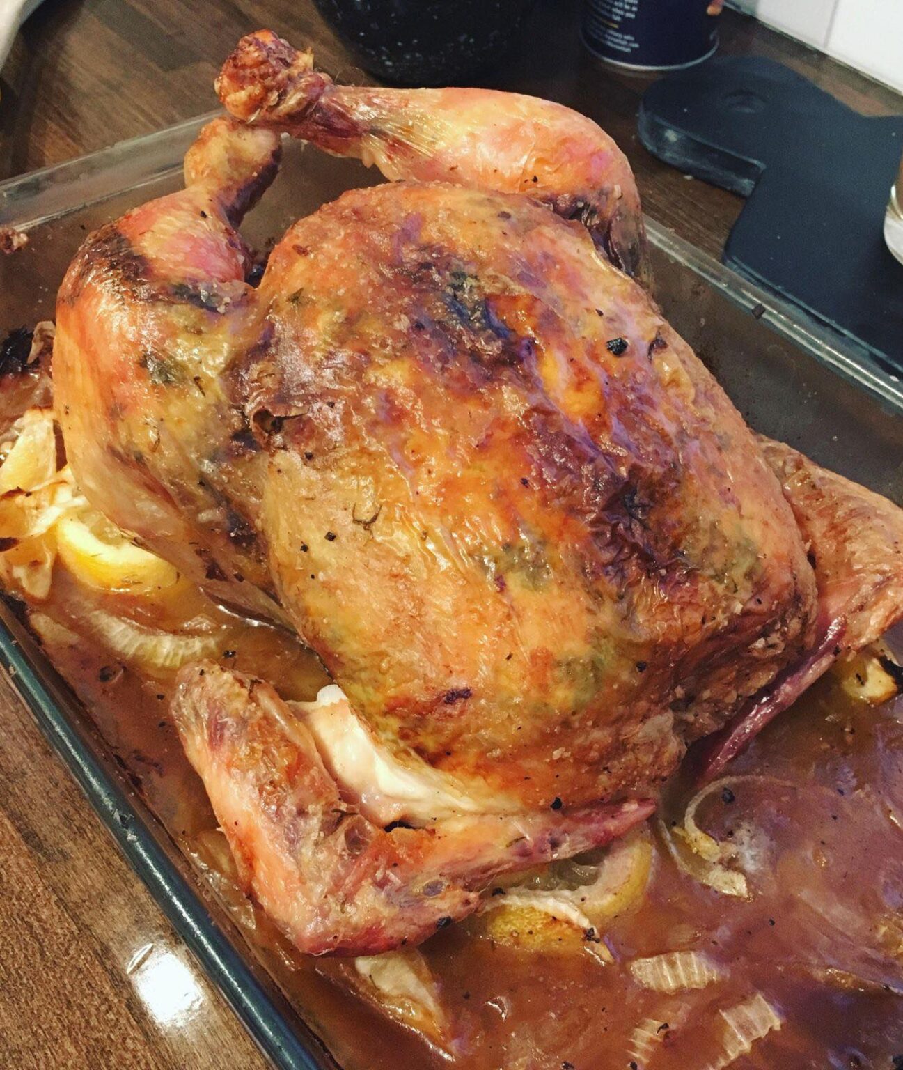 Place the baking dish in the preheated oven and roast for about 1 hour and 20 minutes, or until the chicken is golden brown and the internal temperature reaches 165°F (74°C) in the thickest part of the thigh.