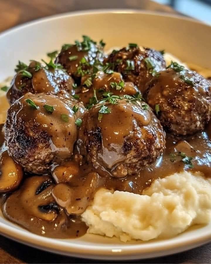 Serve Salisbury steak meatballs with mushroom gravy over mashed potatoes, rice, or pasta.