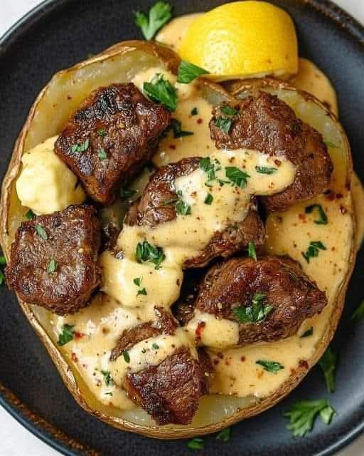 Serve: Spoon the steak bites into each potato, drizzle generously with the Parmesan cream sauce, and serve immediately.