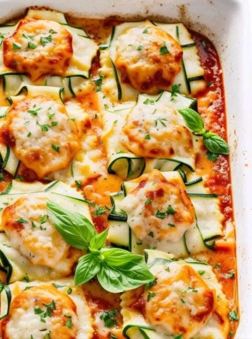 5. Fold the zucchini over the filling to form the ravioli and place them seam-side down in a baking dish.